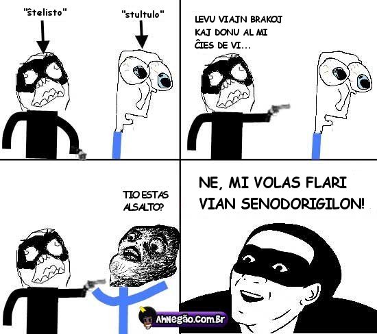 Esti ŝteligita, tio nenio okazas al mi ĝis nuntempe kiam mi poŝtas tion, sed tia mirinda karikaturo bone montras ke vi ne devas uzi stultaĵajn demandojn kiam iu, kiu uzas armilon kaj ion kovrante sian vizaĝon halti vin en la strato kaj paroli kun vi!